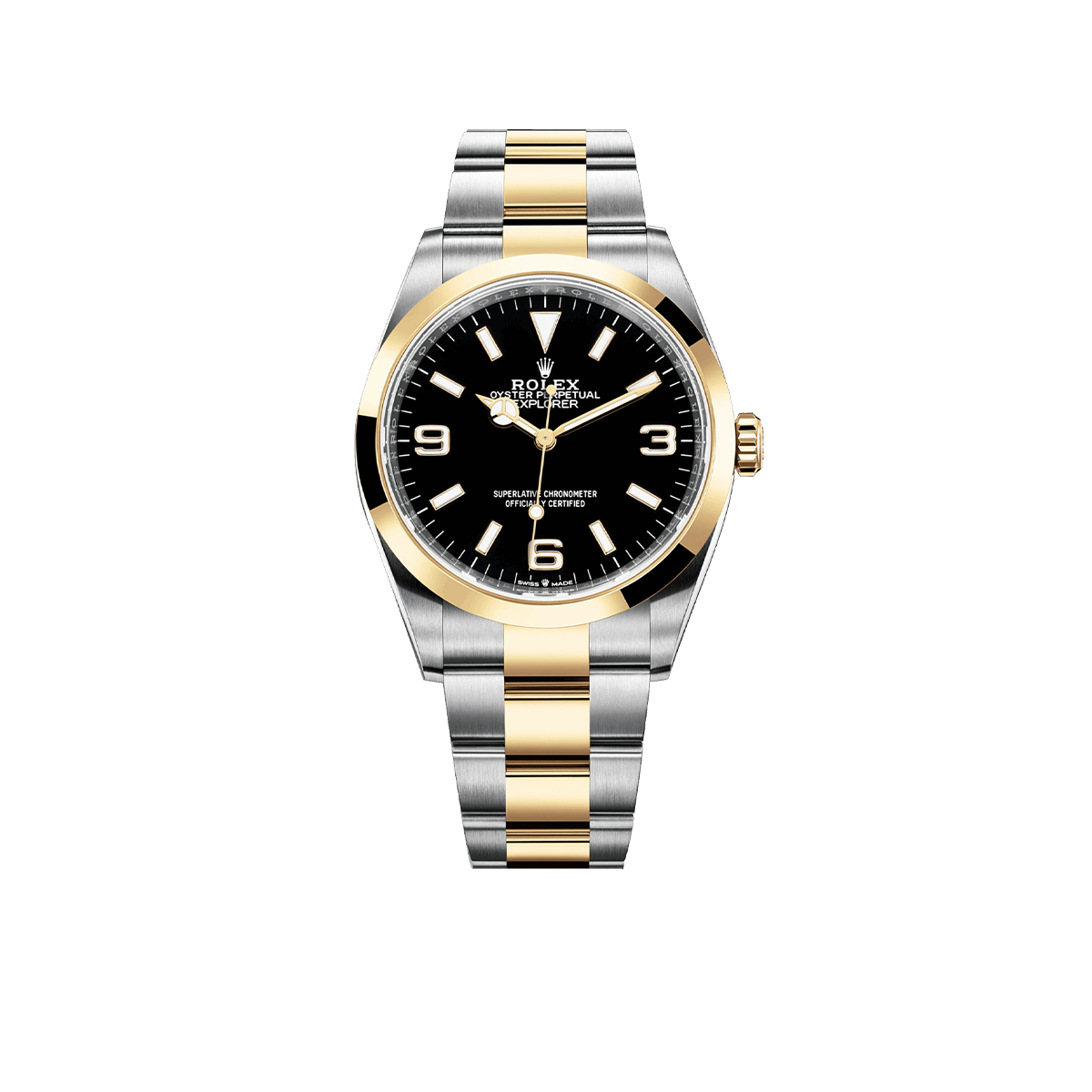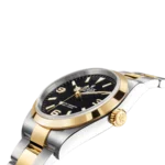 Rolex Explorer 36mm watch with polished 18k Yellow Gold and Stainless steel case. This model has black dial with a polished 18k Yellow Gold hour and minute hands in Mercedes-logo and Breguet-style sword shape with luminous fill. Polished 18k Yellow Gold seconds hand. A distinctive feature of this model is large applied polished 18k Yellow Gold rimmed indexes and 3, 6, 9 Arabic Numerals hour markers with luminous fill. Fine printed minute/seconds track on the dial rim. Highly legible Chromalight display with long-lasting blue luminescence. Polished 18k Yellow Gold patented “Triplock” locking crown ensuring that the crown screws down onto the Oyster case as securely as a submarine hatch. The dial closed by a Scratch-resistant Sapphire Crystal and solid case back made. Stop-seconds for precise time setting. The watch is equipped fixed Smooth polished 18kt Yellow Gold bezel. The movement is mechanical self-winding 3230, containing 31 Jewels and 70 hours of power reserve. This model presented on a Rolex Oyster bracelet of brushed Stainless steel outer links and polished 18k Yellow Gold center links with folding Oysterlock safety clasp with Easylink 5 mm comfort extension link. The water resistance is up to 100 meters/330 feet.